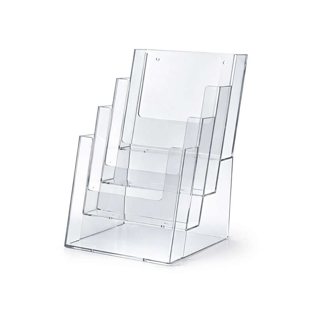 Broschyrställ i högkvalitativ akryl, designat för både vägg- och bordsplacering med plats för 4 stycken A5-broschyrer. Dessa stilrena och lätta broschyrhållare är tillverkade av plexiglas för överlägsen hållbarhet och är idealiska för användning vid mässor och evenemang.