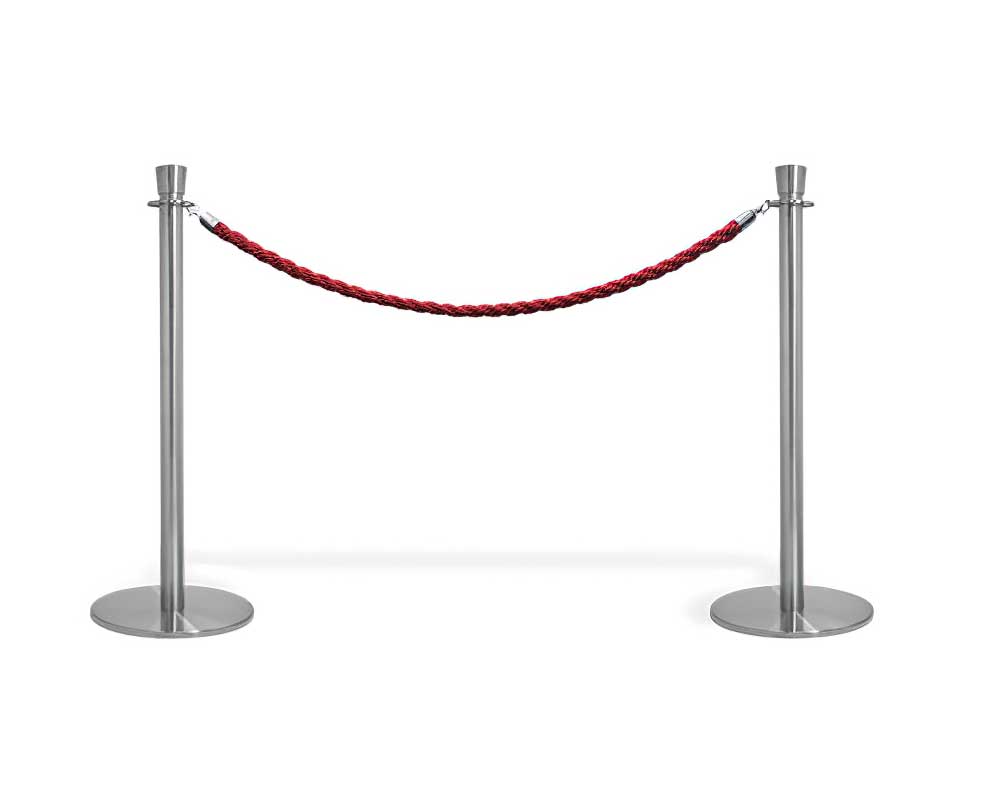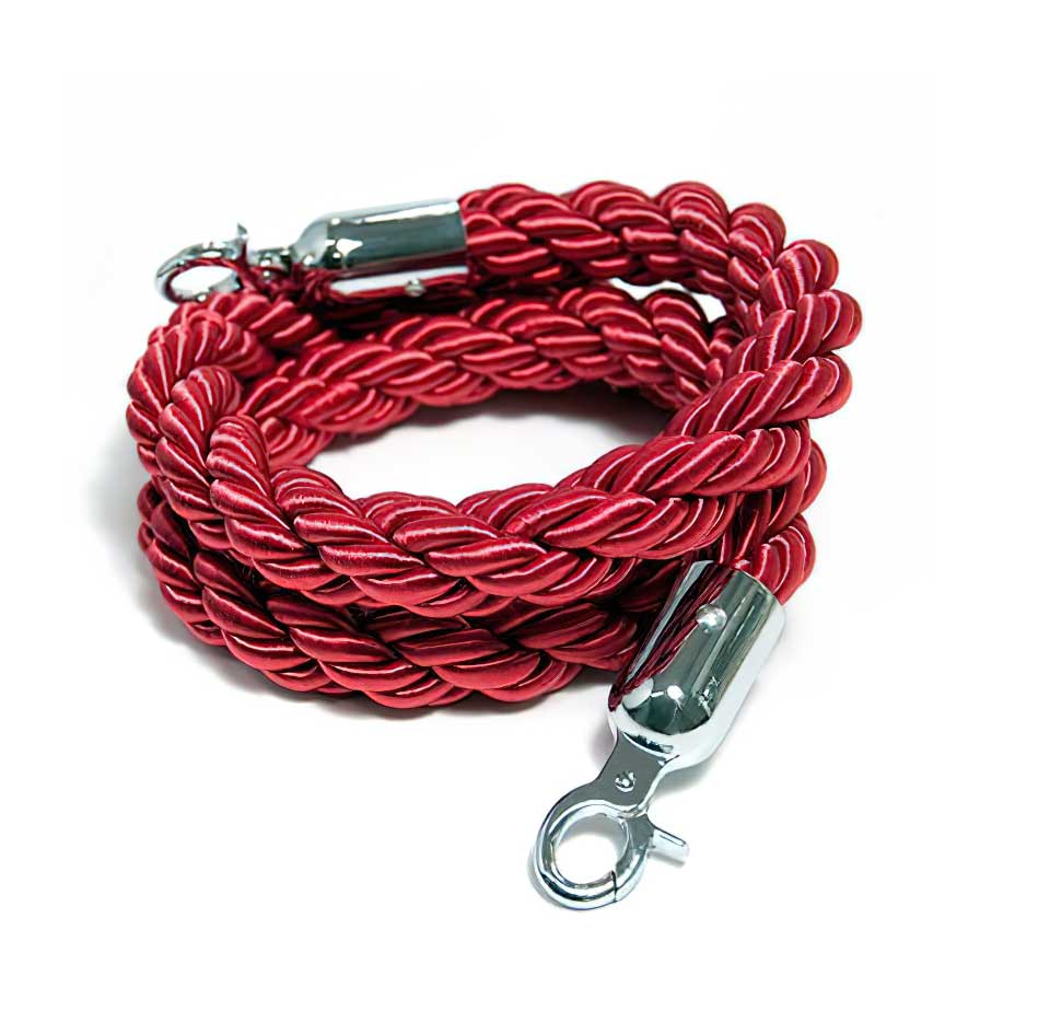 Rep för avspärrningssystem med ståldetaljer färgat i silver och ett rep i röd färg som är tvinnat/flätat.