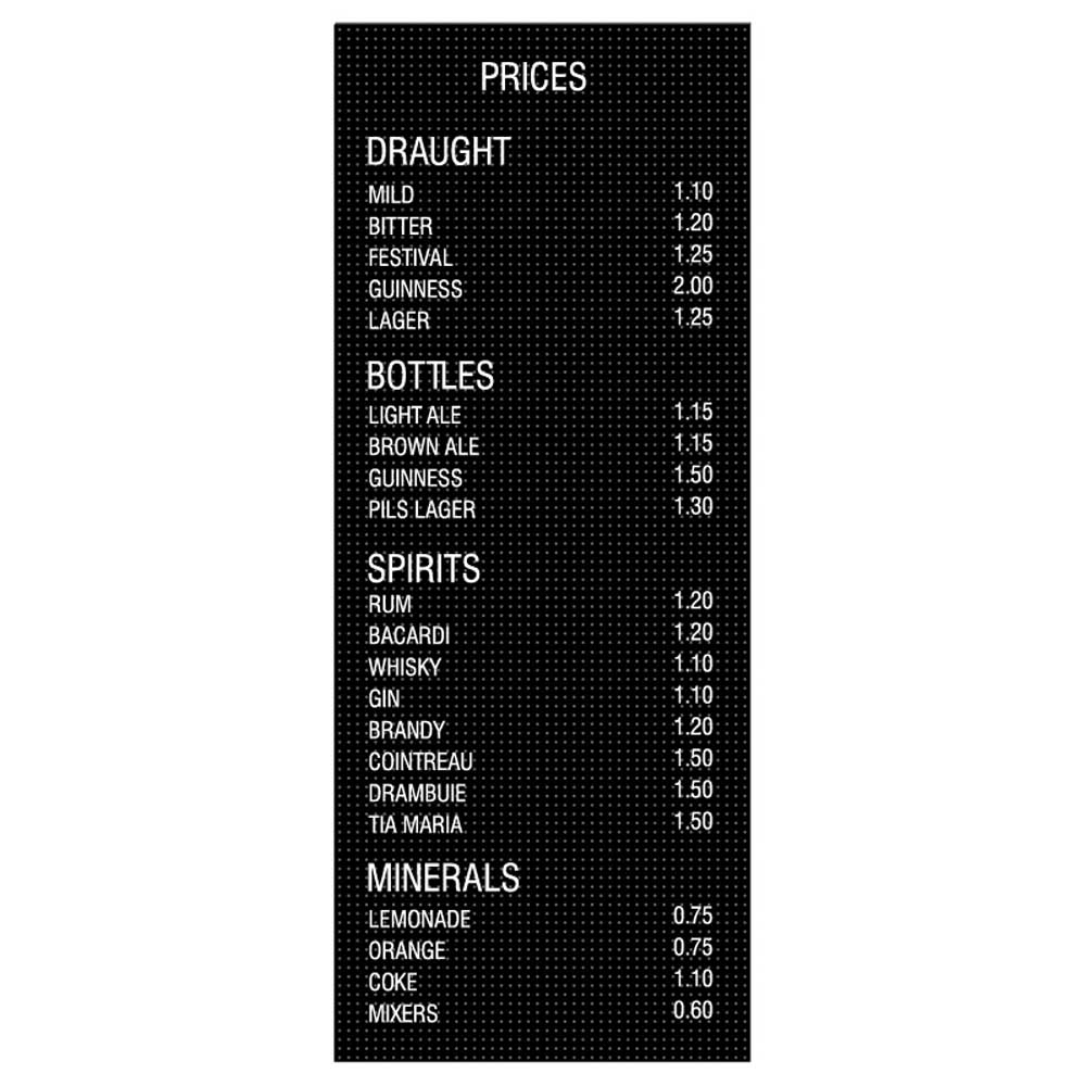 Bokstavstavla Peg i storlek 310x767mm är med sin långsmala design perfekt för prislistor och menyer. En håltavla skapar en gammaldags stil vilket ger ditt företag ett äkta intryck och genuint intryck. Med en menytavla som har vita bokstäver på svart bakgrund skapar du en varm hemtrevlig känsla som blir en stark kontrast till moderna digitala alternativ.