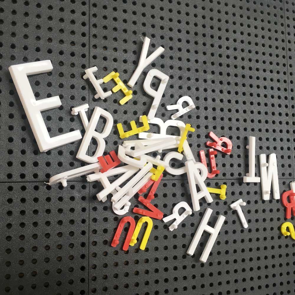 Denna retro håltavla har en slank ram i hårdplast som ramar in den perforerade PVC-panelen. Den perforerade ytan är för bokstäver och siffror med piggar på baksidan. Dessa trycks enkelt fast i tavlans hål, vilket gör det smidigt att ändra eller skapa nya menyer och prislistor. Bokstavstavla Peg är har diskreta integrerade öglor för smidig och osynlig upphängning.
