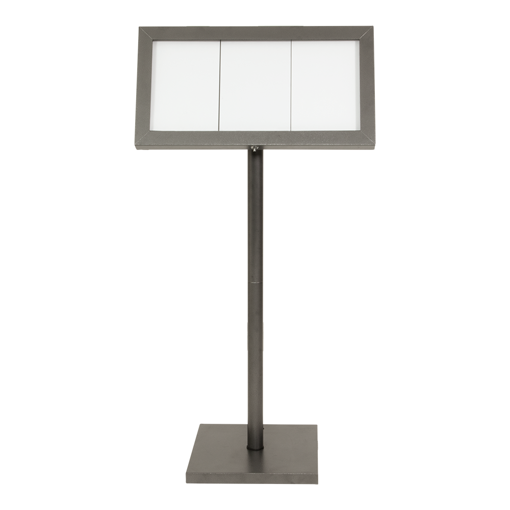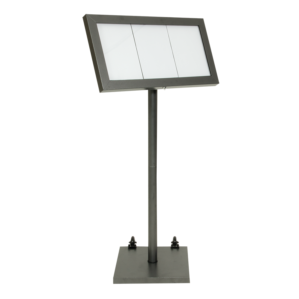 Ett snyggt och modernt låsbart skyltskåp i rostfritt stål med plats för 3 x A4 papper för din restaurang eller butik. Skåpet är perfekt för menyer eller annan information och är utrustat med LED-belysning som kan styras av en multifunktionell fjärrkontroll som medföljer. Detta skåp är av hög kvalitet och är skyddat för att kunna stå emot alla väder men passar bra likaväl inomhus som utomhus. (Se val med eller utan stolpe).