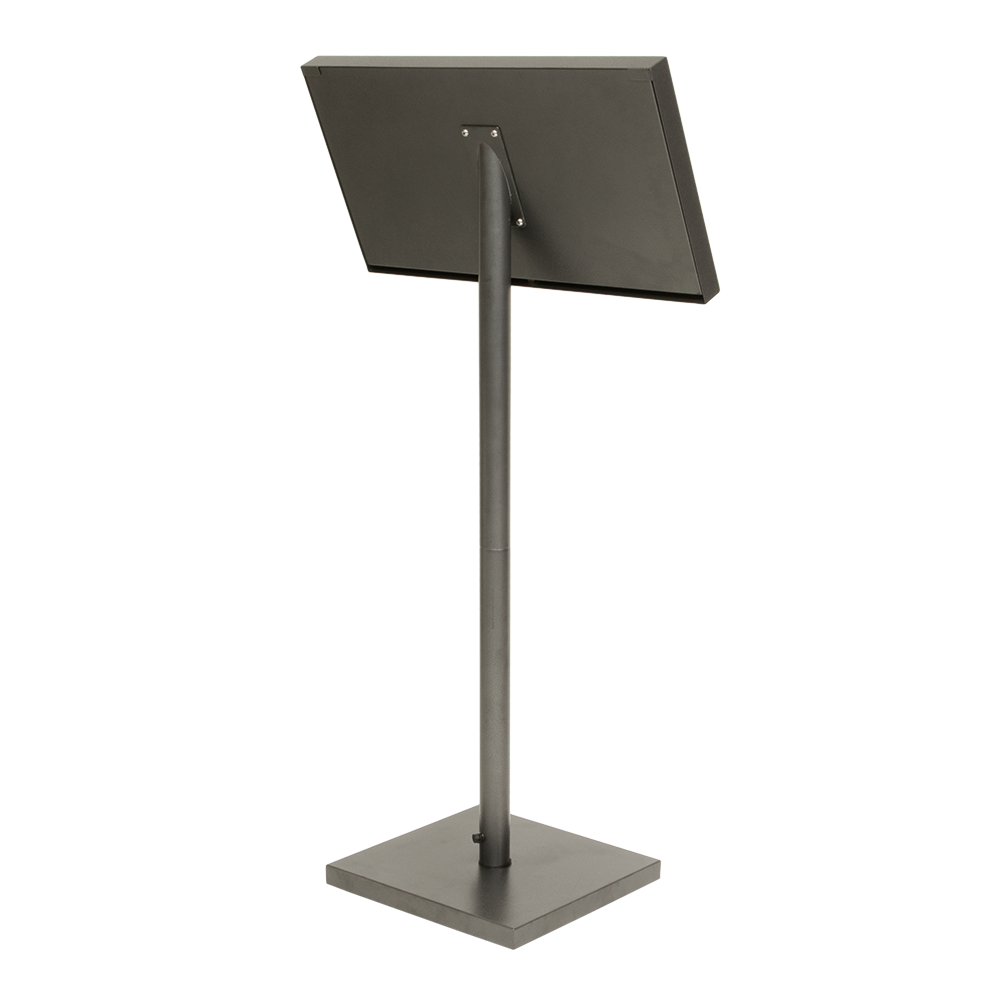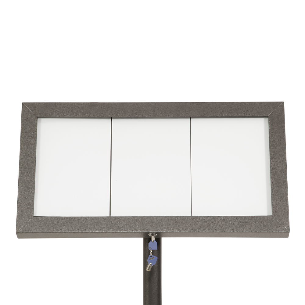 Skyltskåpet har en robust ram med en texturerad finish som påminner om ytan på hammarlack beläggning. Metalpanelen på insidan gör det enkelt och smidigt att sätta upp papper och andra blad med medföljande magneter. Denna informationstavla kan monteras på vägg men för dig som behöver ett mobilt alternativ kan du välja skylten med stolpe och fot. Rullhjul finns som extra tillbehör att köpa till för att lättare förflytta skyltskåpet. För dig som vill slippa kablarna för belysningen så finns det ett batteripack med en användningstid på 8-12 timmar att köpa till (Se tillbehör).