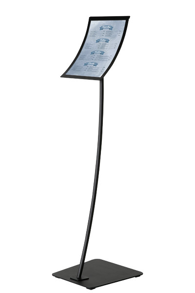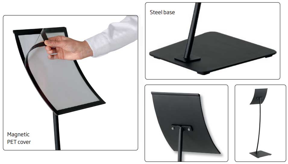 Curved Infoställ för A4 med en svart fot i stilren bågig design och rmagnetisk ram är idealiskt för mässor och utställningar. Eftersom denna affischhållare är utrustat med en praktisk magnetisk ram som är monterad på en expostång blir det enkelt att byta budskap och affischer.