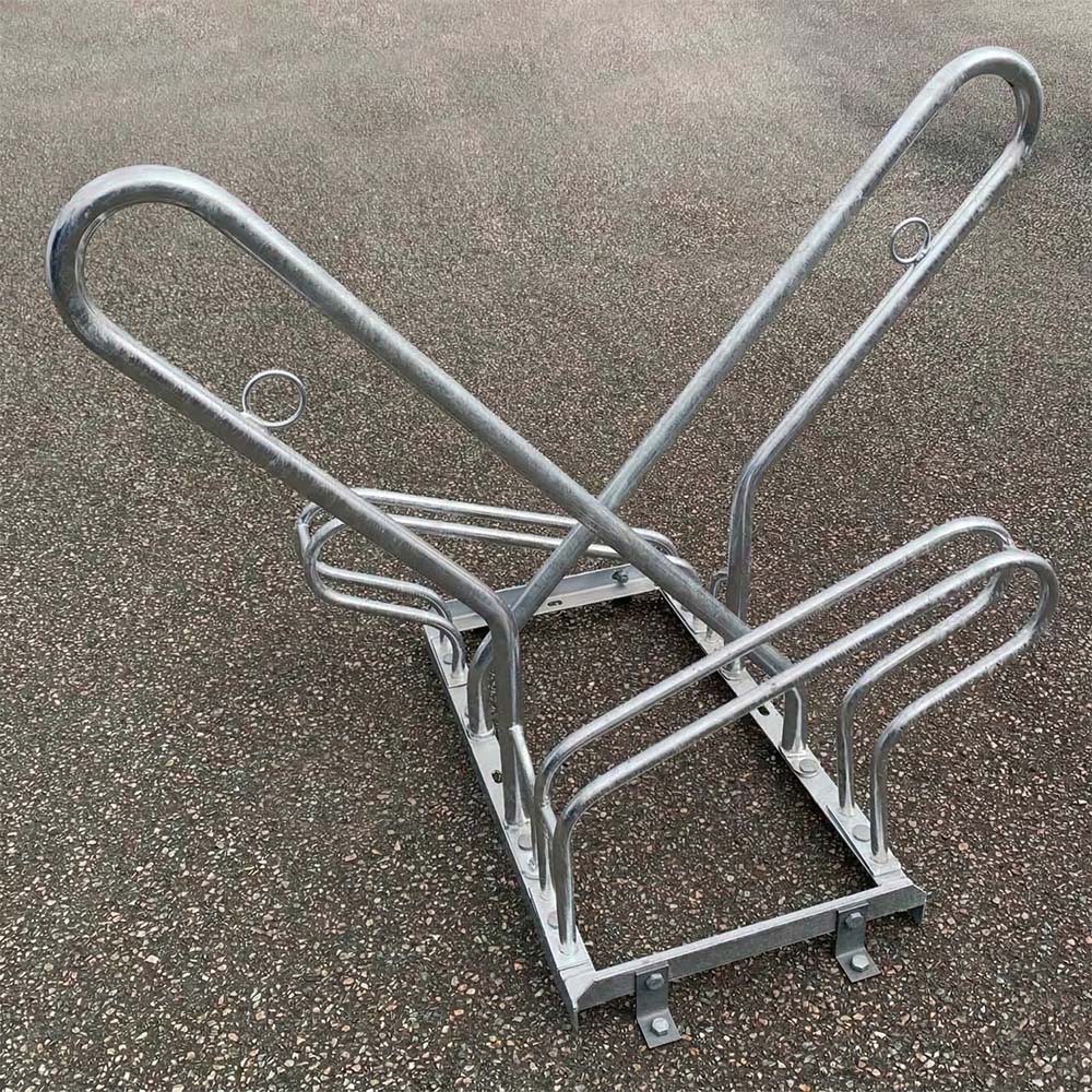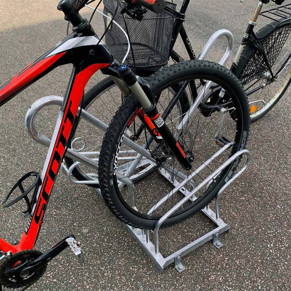Detta cykelställ har varit en storsäljare i över 20 år och är väldigt populär på skolor och i offentliga miljöer. Detta är ett varmgalvaniserat cykelställ med hög och låg parkering för att spara utrymme. Det går i efterhand att öka antal platser genom att enkelt sammankoppla ställen. Det är också enkelt att köpa till ny hjulhållare för att byta ut om olyckan varit framme. Cykelställen är förberedda för markfästen.