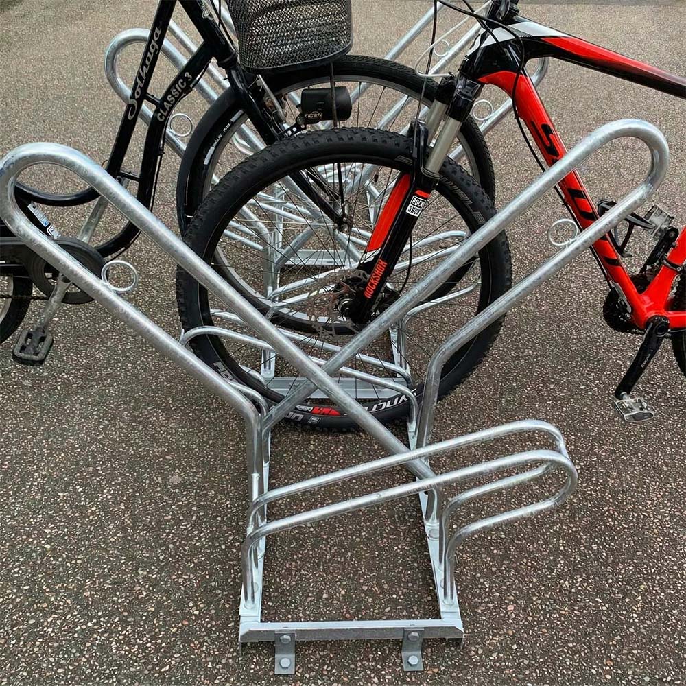 Detta cykelställ har varit en storsäljare i över 20 år och är väldigt populär på skolor och i offentliga miljöer. Detta är  ett varmgalvaniserat cykelställ med hög och låg parkering för att spara utrymme. Det går i efterhand att öka antal platser genom att enkelt sammankoppla ställen. Det är också enkelt att köpa till ny hjulhållare för att byta ut om olyckan varit framme. Cykelställen är förberedda för markfästen.