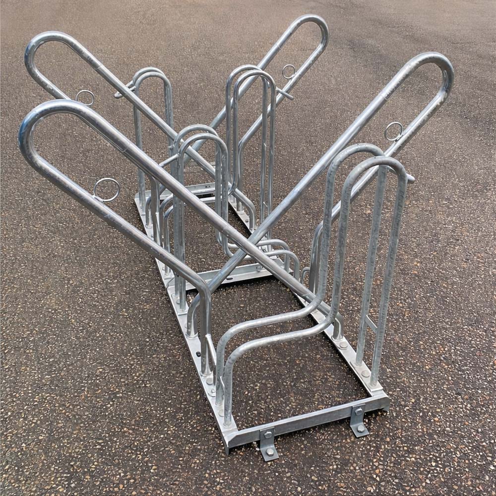 Detta cykelställ har varit en storsäljare i över 20 år och är väldigt populär på skolor och i offentliga miljöer. Detta är ett varmgalvaniserat cykelställ med hög och låg parkering för att spara utrymme. Det går i efterhand att öka antal platser genom att enkelt sammankoppla ställen. Det är också enkelt att köpa till ny hjulhållare för att byta ut om olyckan varit framme. Cykelställen är förberedda för markfästen.