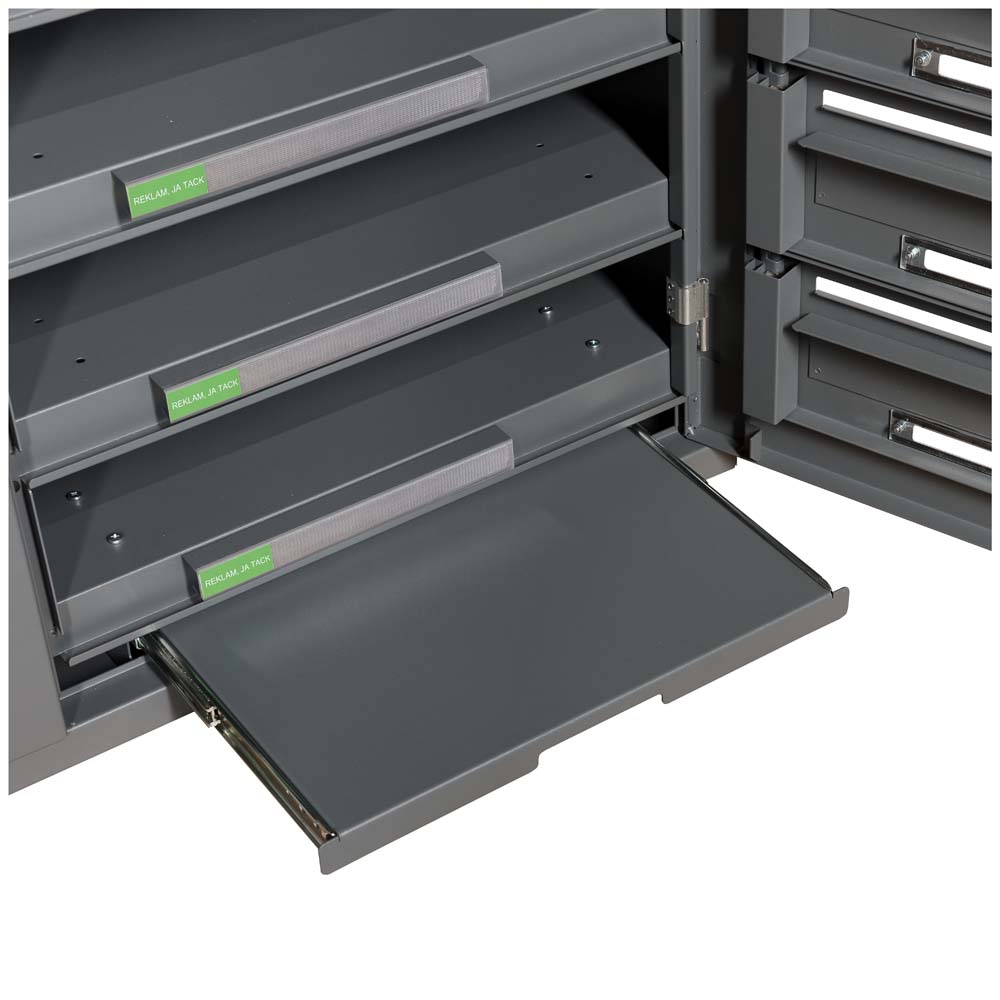 Avlastningsbord till Renz Excellence ger brevbäraren en praktisk plats att sortera och distribuera posten. När huvuddörren till fastighetsboxen är öppen kan man enkelt rulla ut bordet för att sortera och distribuera posten.