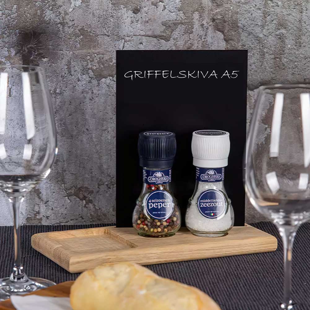 Griffelskiva A5 är perfekt för att framhäva dina dagliga erbjudanden, nyheter eller personliga hälsningar till gäster. Denna griffel är dubbelsidig och kan med fördel användas på restaurang, café, konditori, pub, restaurang eller hotell.