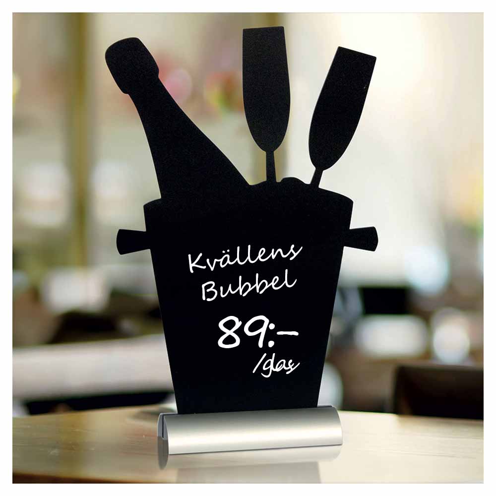 Investera i en griffeltavla som håller och skapar en unik och elegant atmosfär. Beställ din siluett champaign idag för att marknadsföra kvällens drink, champagneflaska, Prosecco eller bubbel.