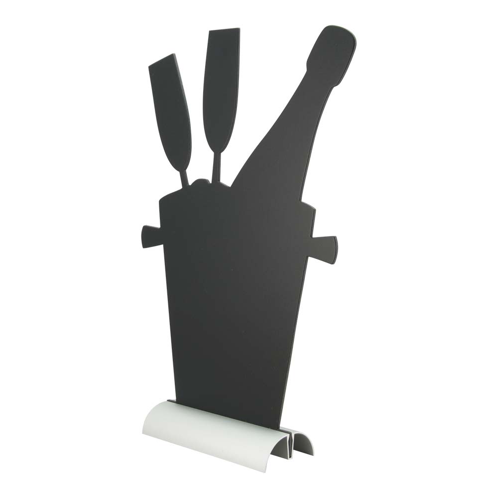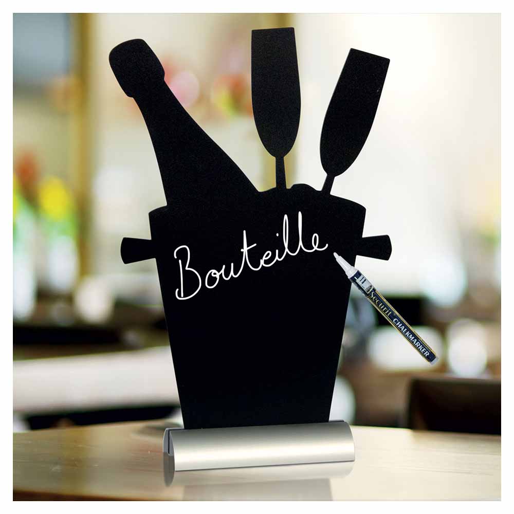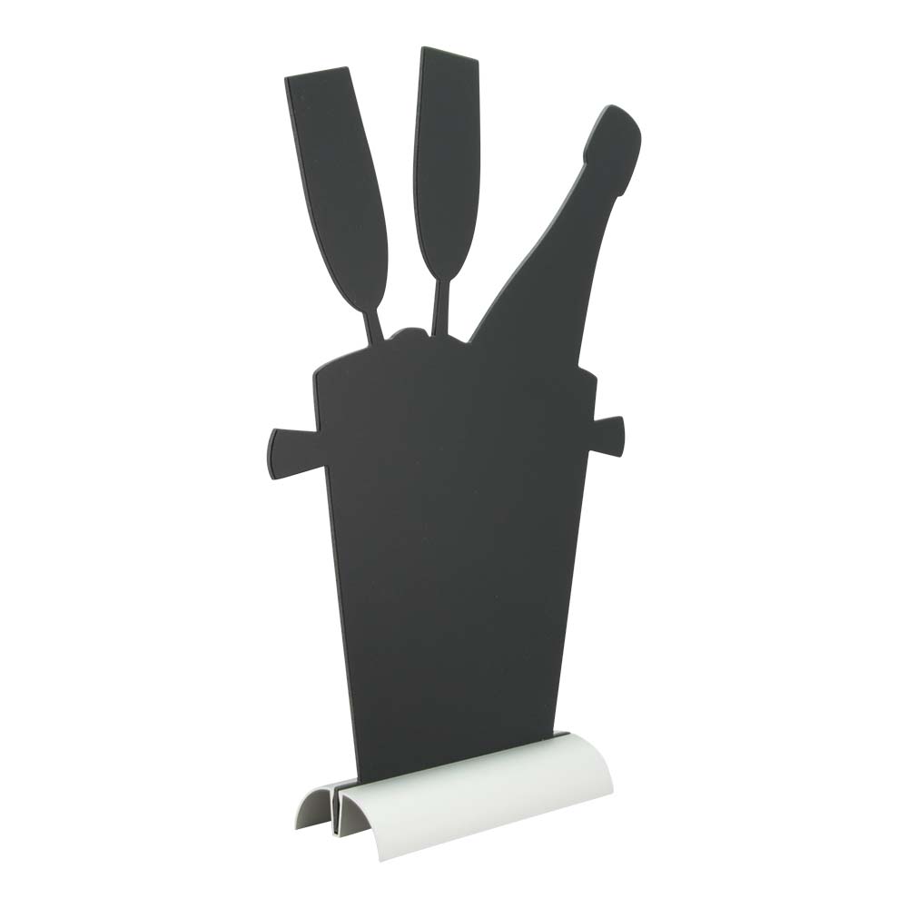 Griffelskiva bord silhuett Champagne är ett bordsställ som har en silhuett av en champagneflaska och glas som står i en snygg aluminiumfot av hög kvalitet för att denna bordsgriffel ska stå stadigt på bordet, baren eller disken.
