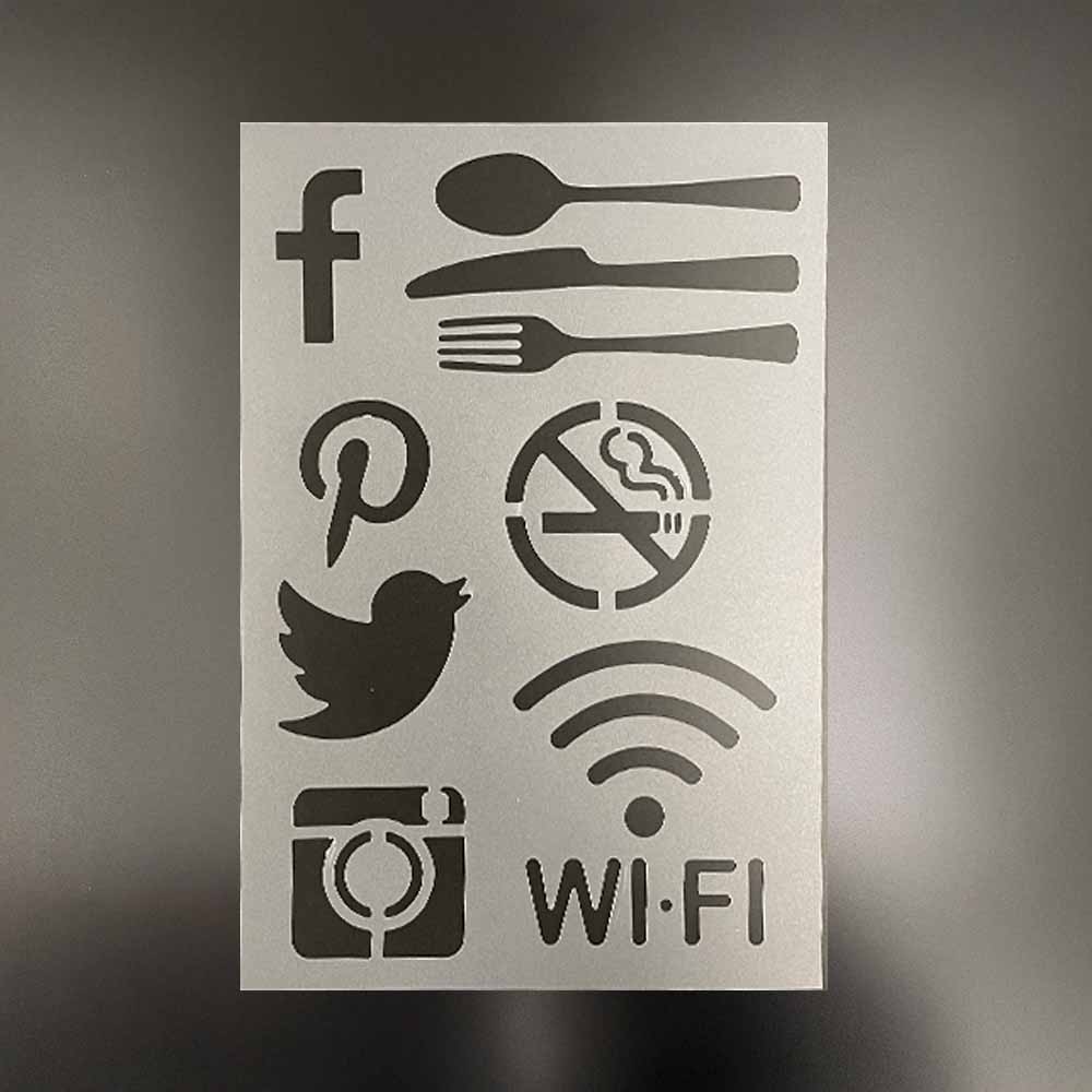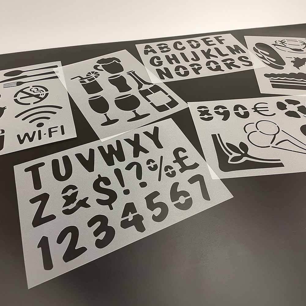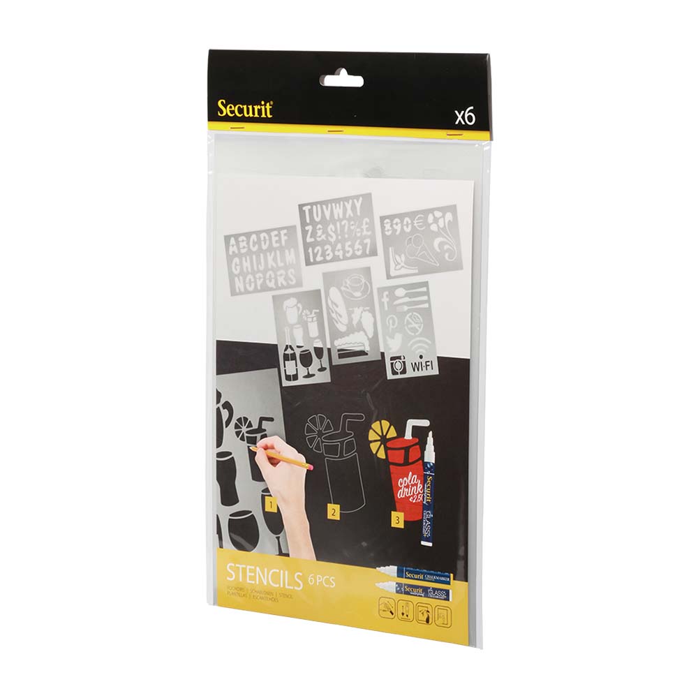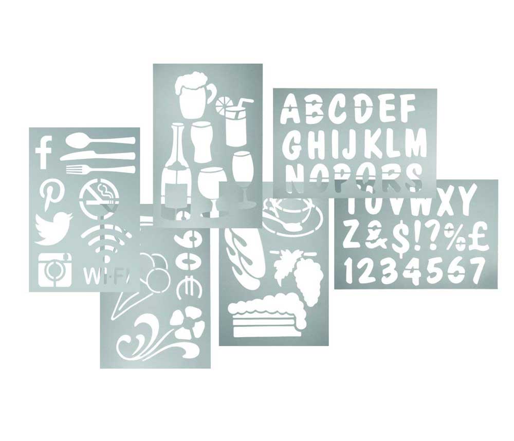 Stencil Set - Schabloner för griffeltavla. Behöver du hjälp med att texta och rita på din griffeltavla är vårat set med schabloner ett utmärkt verktyg att använda sig av. Men bokstäver, siffor, symboler och bilder får du möjligheten att skapa snygga och kreativa griffeltavlor oavsett om du vill marknadsföra en produkt, ett erbjudande eller en meny.