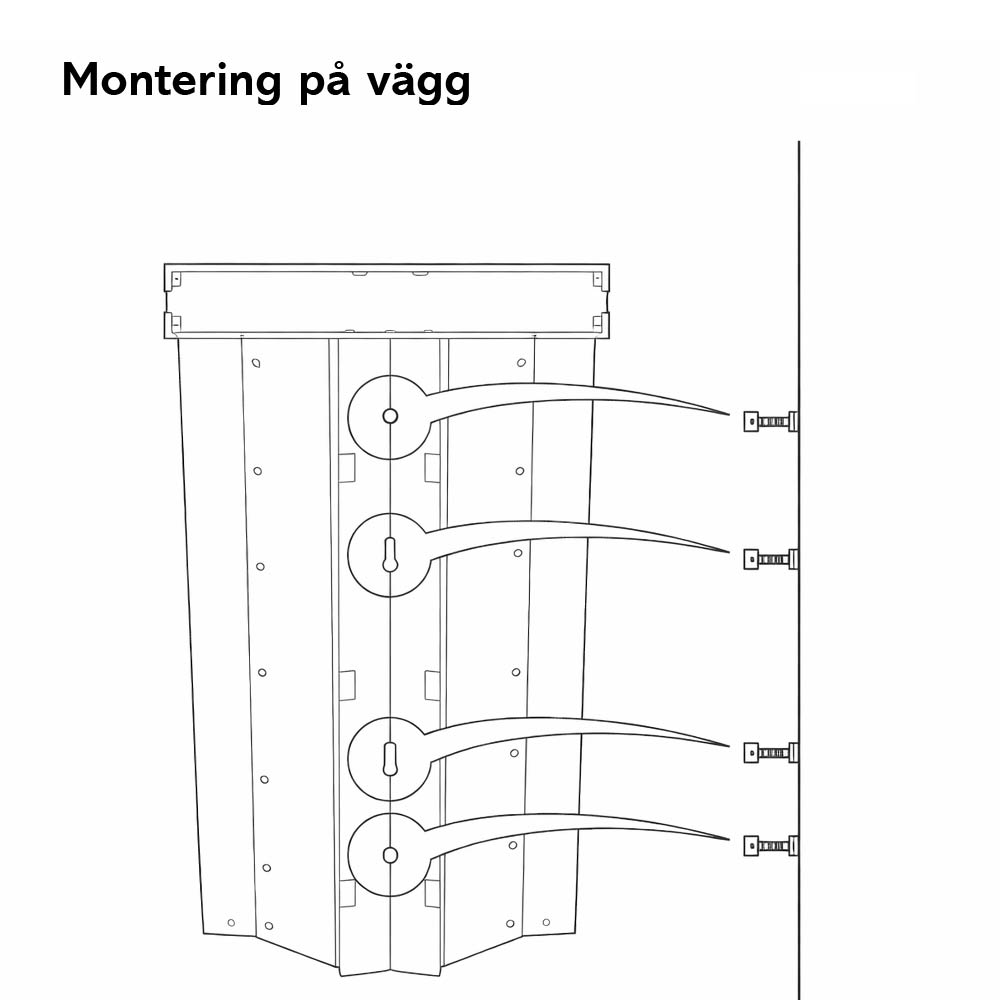 Varje detalj i designen är noggrant genomtänkt och tillverkad av robust varmförzinkad och pulverlackerad plåt. Ett skyddande lock bidrar till att säkra innehållet. En praktisk bygel i matchande färg håller sopsäcken säkert på plats. Genom att enkelt fälla upp bygeln och luta korgen 45 grader framåt blir det enkelt att ta bort plastpåsen. Klämmor för rörmontage samt monteringsplugg och skruv för väggmontage ingår.