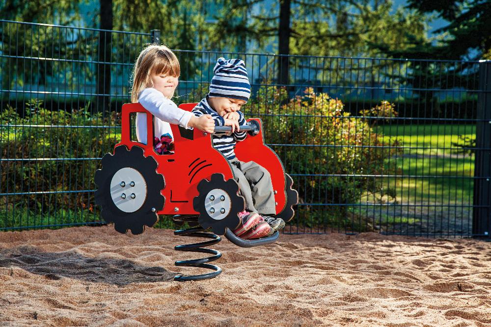 Gungan har en lackad spiralfjäder i stål som ger en jämn rörelse vid användning. Den kan monteras på markplatta eller med stativ för nedgrävning och finns även utan monteringsalternativ för platser med befintliga detaljer. Fjädergunga Traktor är anpassad för barn från 2 år och uppåt och passar väl i parker, lekplatser och förskolemiljöer.