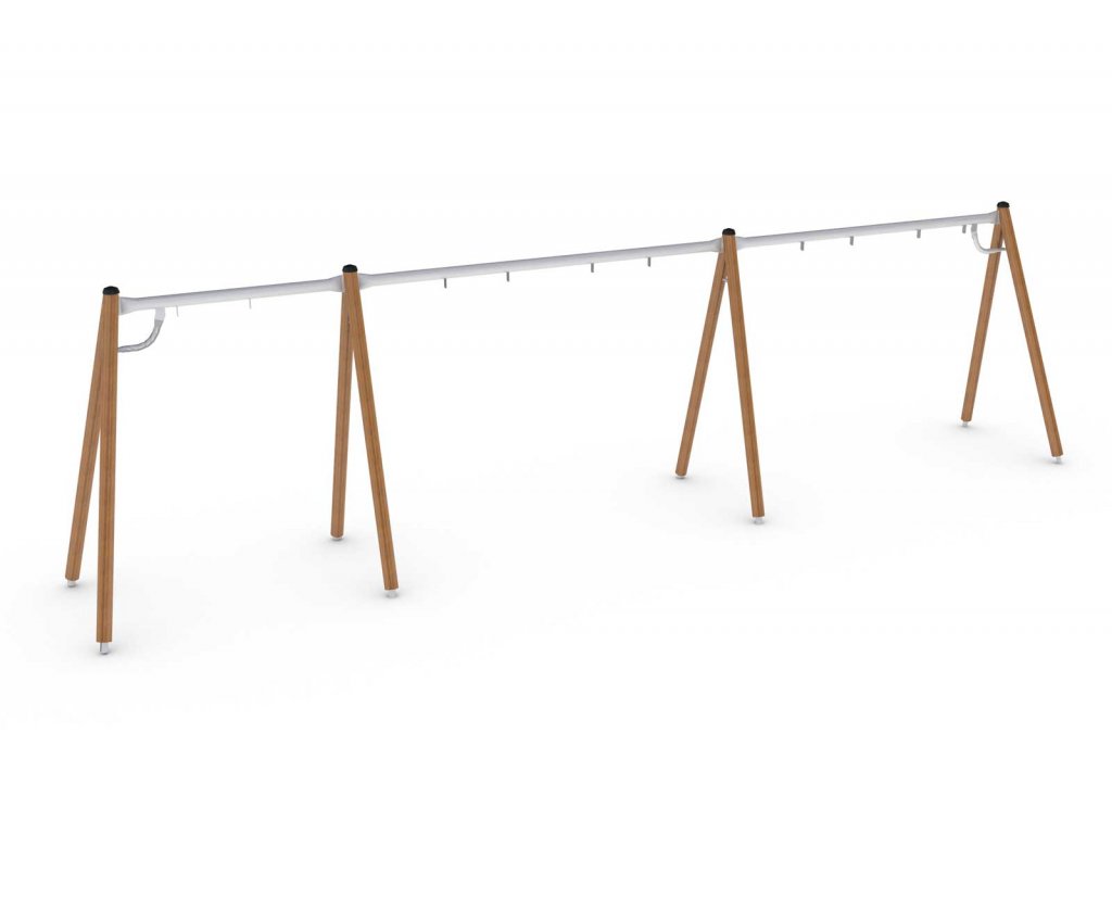 Gungställning Goro med 5 platser är en tidlös gungställning tillverkad med trästolpar och galvaniserat stål för antingen platsgjutning eller nedgrävning.
