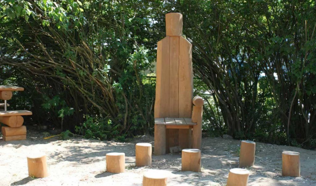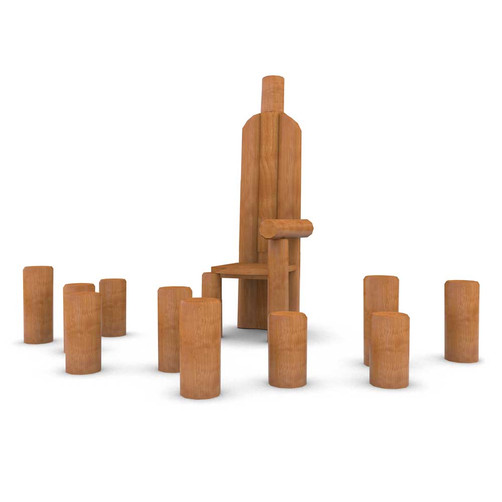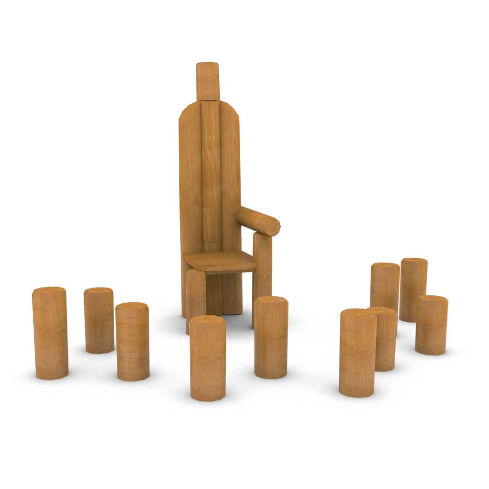 Irion består av en tronstol med tillhörande 10 trästubbar och är en lekutrustning som bjuder in till både fysisk aktivitet och fantasilek. Tronstolen har en hög rygg som ger känslan av en kunglig tron, vilket inspirerar till roliga lekar och berättelser. Stubbarna kan placeras ut fritt för att skapa spännande balansbanor eller hinder där barn kan leka "inte nudda marken" och träna kroppskontroll på ett roligt sätt.
