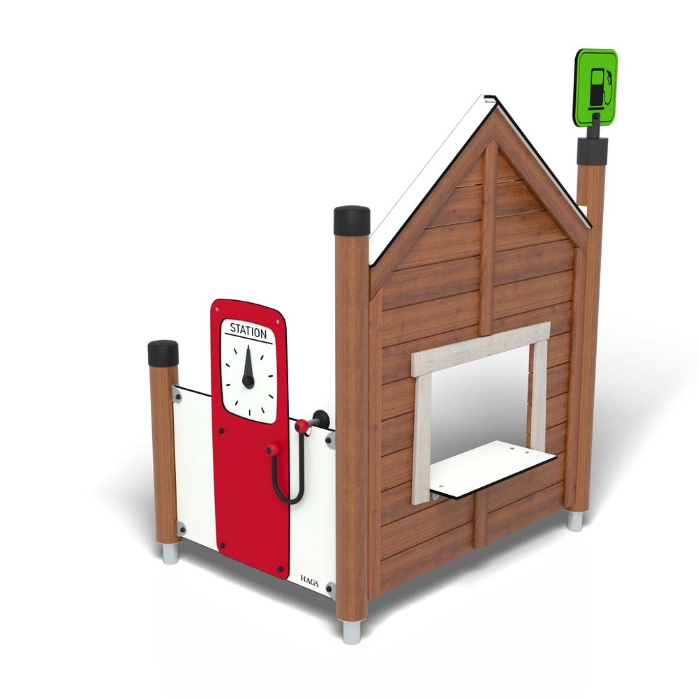 Låt barnen kliva in i en värld av kreativitet och fantasi med detta charmiga lekhus i form av en bensinmack! Här kan de tanka fordon med bränsle, fylla på luften på däcken och sälja korv med bröd. Lekhus Bensinstation är en del av Play Town-serien och finns i två varianter – anpassat för nedgrävning eller placering ovan mark.