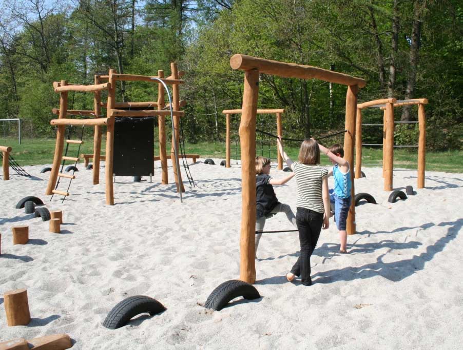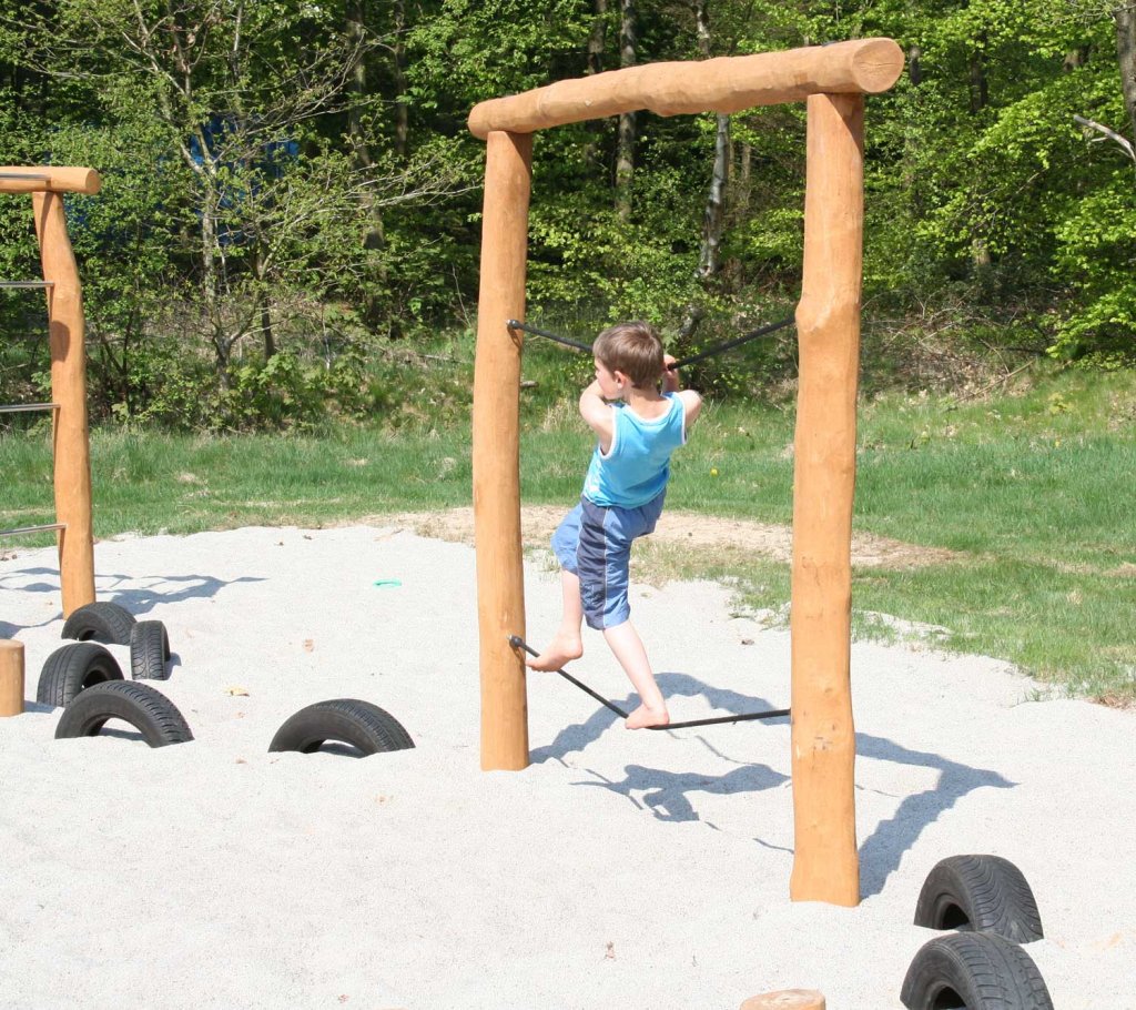 Mesus repgång är tillverkad av robinia och ger barn möjlighet att träna styrka, balans och smidighet. Konstruktionen består av robiniastockar med rep som fungerar som gångbana och handstöd.