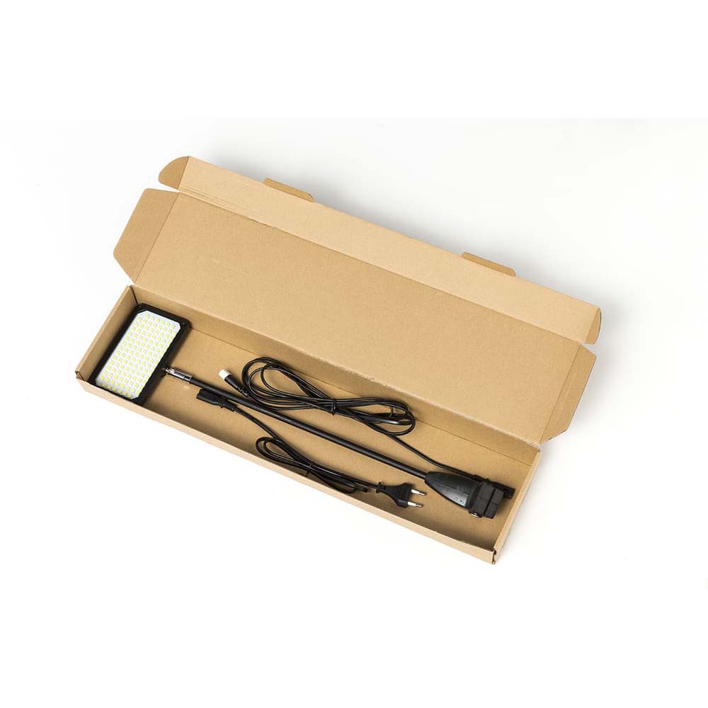 Belysningen ger ett neutralt ljus som framhäver tryck och budskap utan att skapa hårda skuggor. Strömkontakten kan placeras på baksidan eller på vänster/höger sida beroende på hur montern är uppbyggd. Upp till tio enheter kan anslutas till samma strömuttag, vilket gör lösningen flexibel även för större monterytor.
