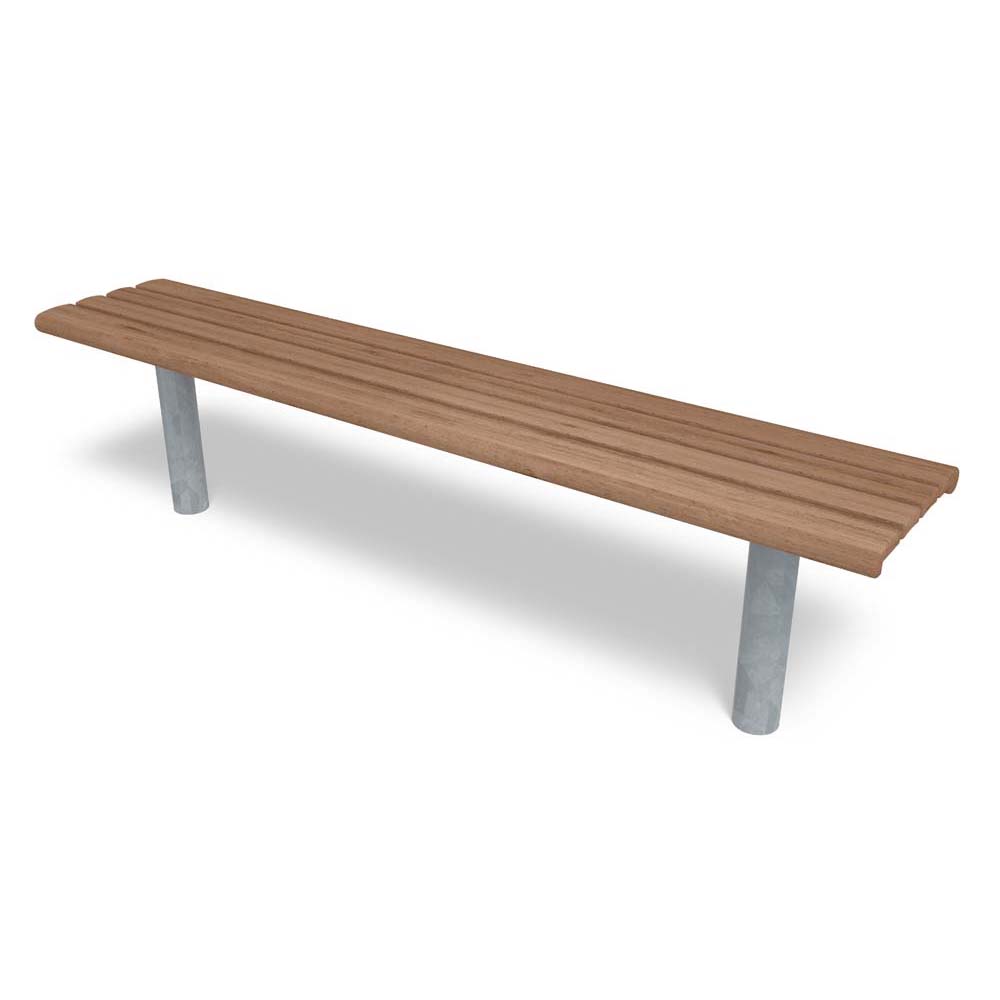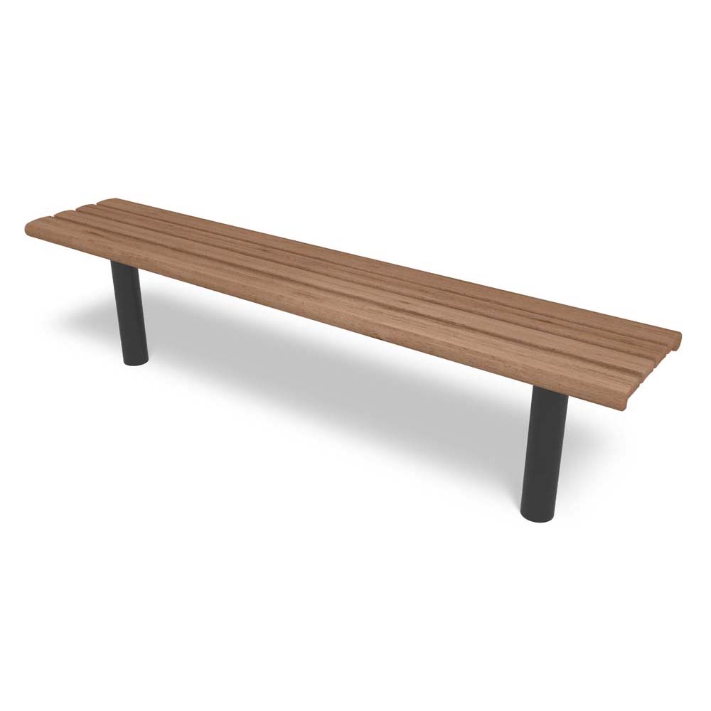 Sitsen på denna parkbänk består av breda ribbor i FSC-certifierad furu, behandlade med värme eller vattenbaserad lasyr. Bänkens stomme är tillverkad i varmförzinkat eller svart pulverlackerat stål för bästa hållbarhet. Ett diskret men genomtänkt formspråk gör att bänken smälter in i både urbana och gröna miljöer.