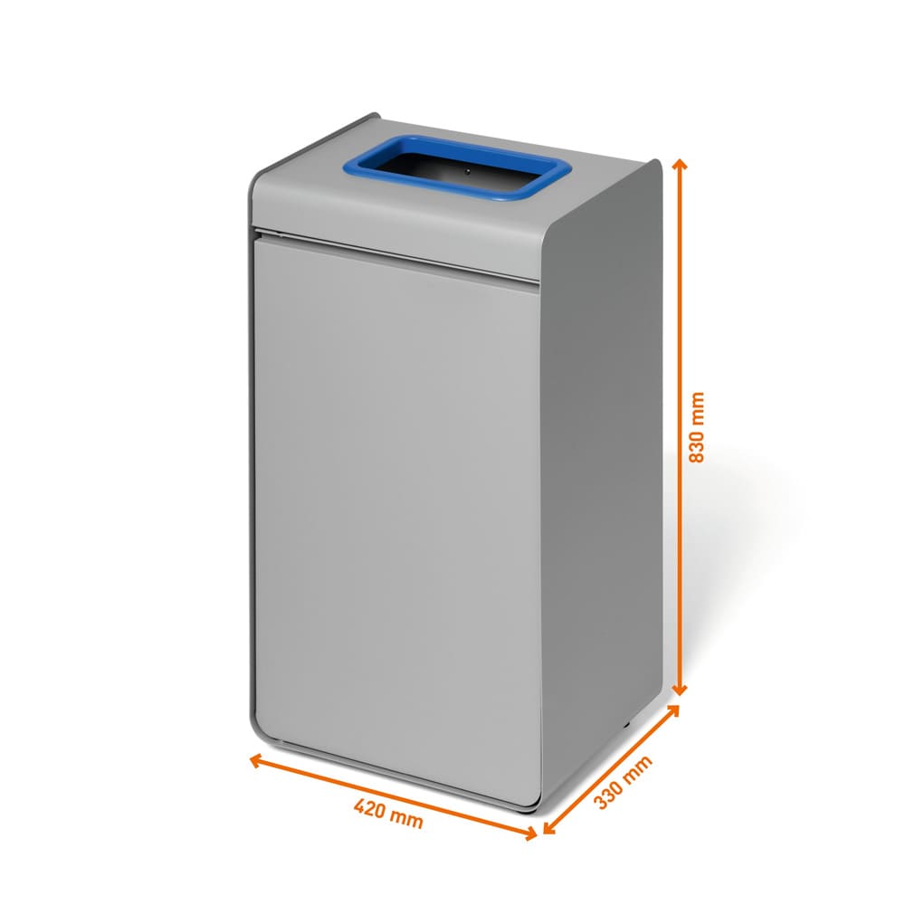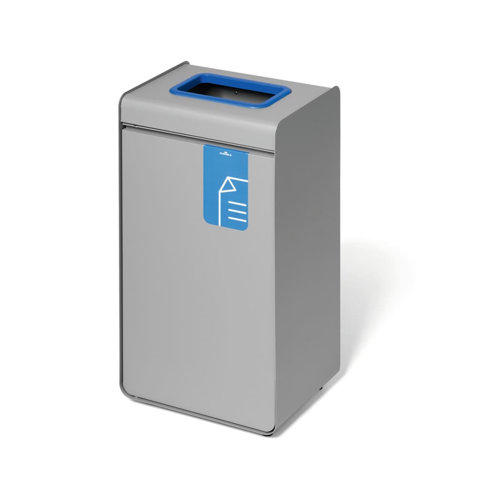 DURASORT® 55 liter är ett källsorteringskärl tillverkat av pulverlackerad metall med en borttagbar innerbehållare i plast, utvecklat för lång livslängd och daglig användning i professionella inomhusmiljöer. Den stabila konstruktionen kombineras med en blå färgmarkerad öppning och tydlig papperssymbol för korrekt avfallssortering.