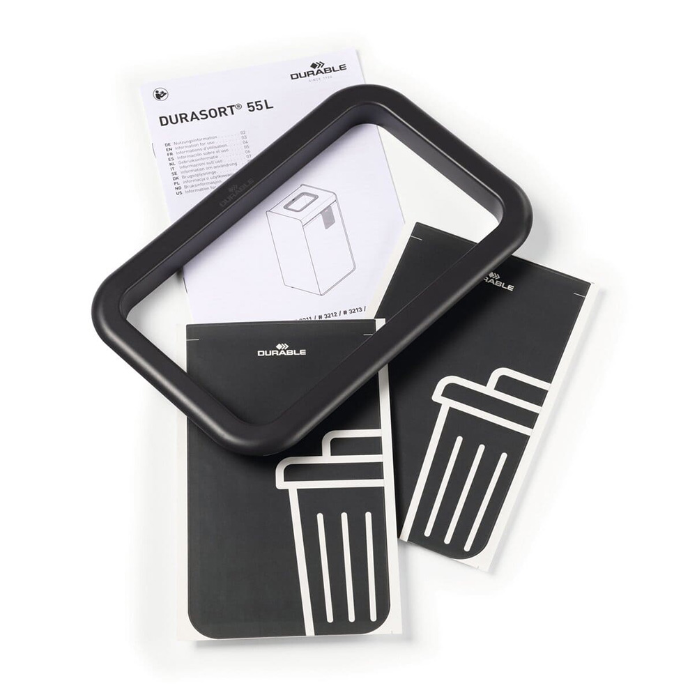 DURASORT® 55 liter är ett källsorteringskärl tillverkat av pulverlackerad metall med borttagbar innerbehållare i plast. Konstruktionen är framtagen för lång livslängd och daglig användning i professionella inomhusmiljöer. Den antracitgrå öppningen och symbolen ger tydlig visuell vägledning för restavfall.