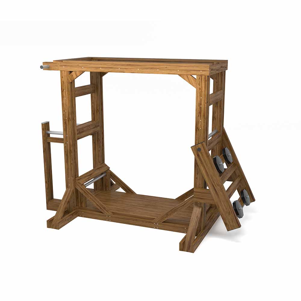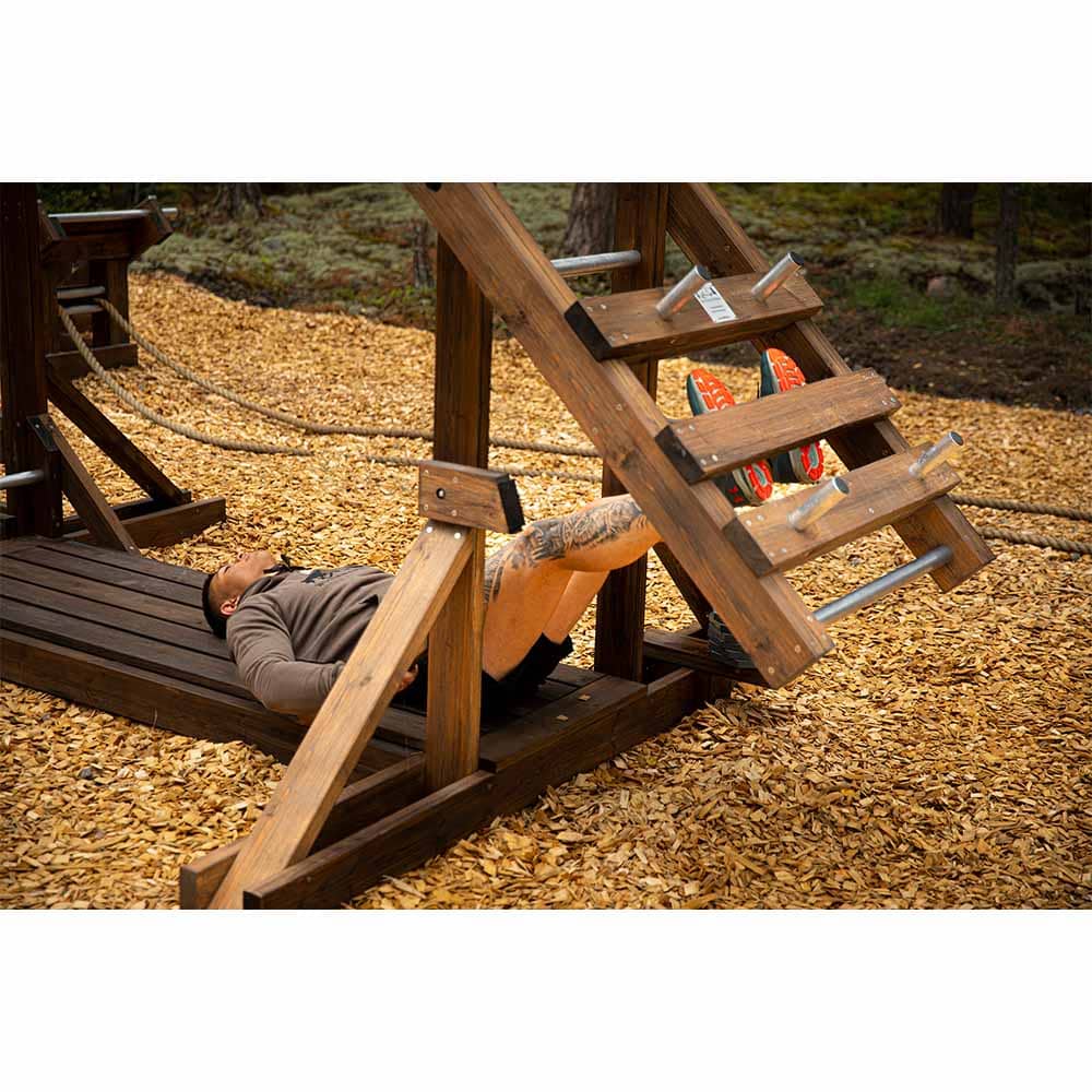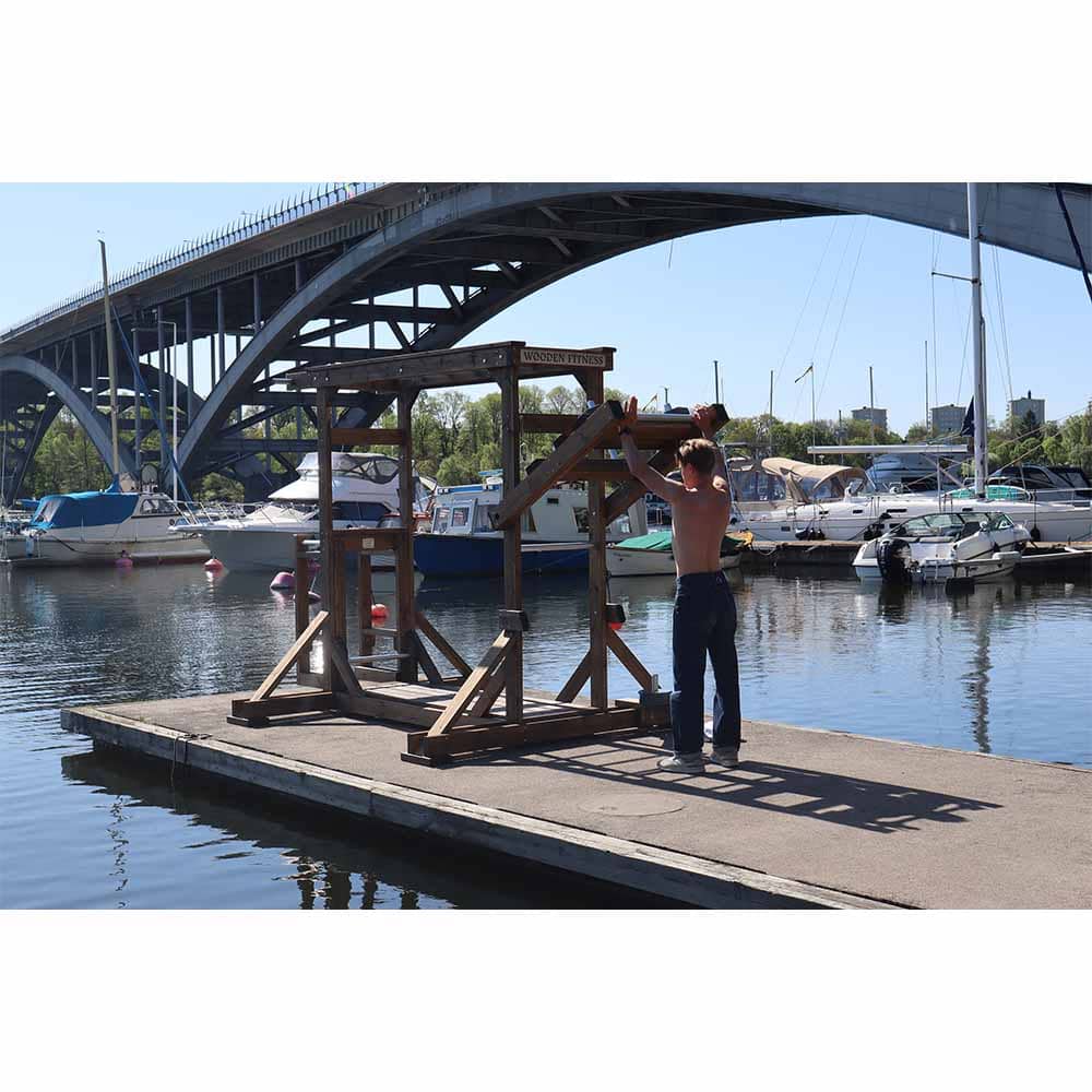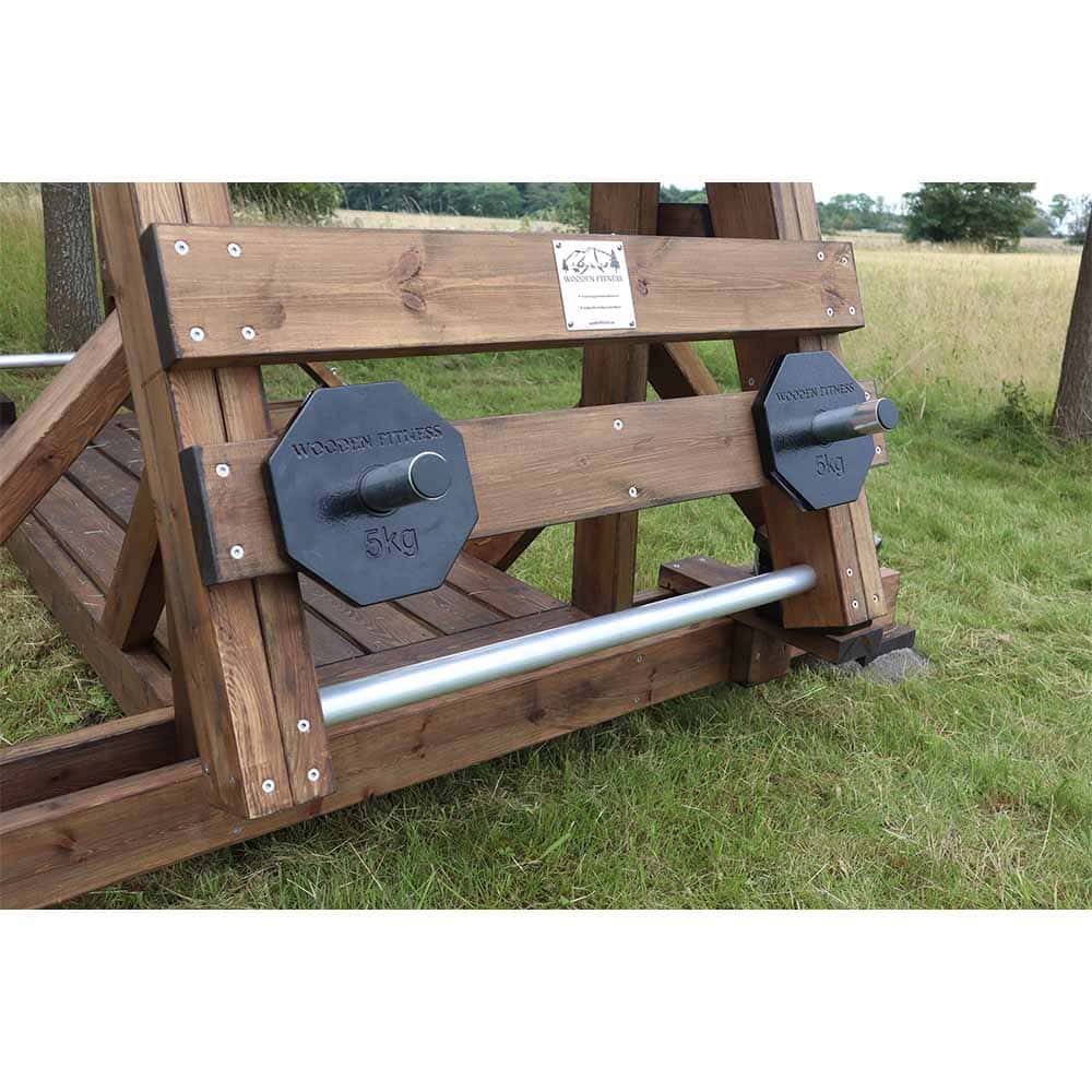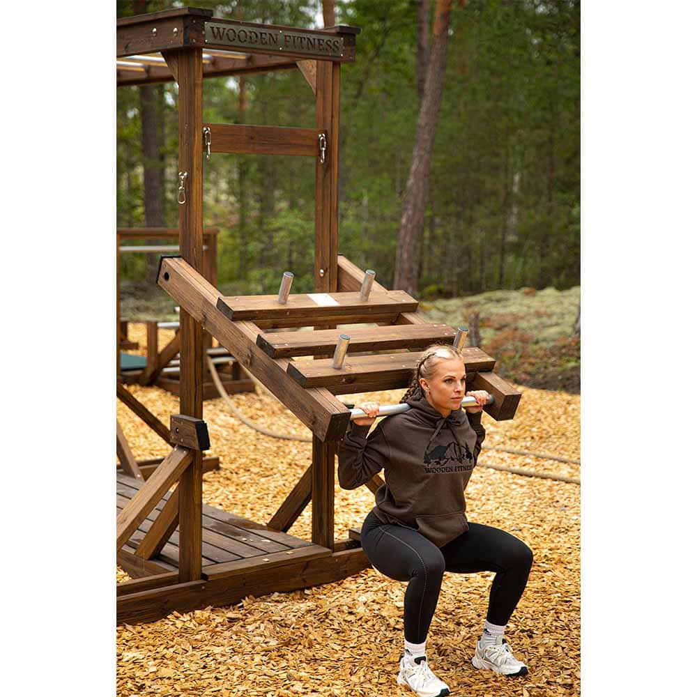 Den här träningsutrustningen för är utomhusbruk är ett effektivt utegym i trä som ger möjlighet till helkroppsträning med både kroppsvikt och vikter. Här tränar du rodd, benpress, knäböj och axelpress i en station anpassad för två användare samtidigt. Gymmet levereras med åtta robusta viktskivor (5 kg styck), producerade i Sverige för utomhusbruk, samt en momentarm med fast vikt på 20 kg.